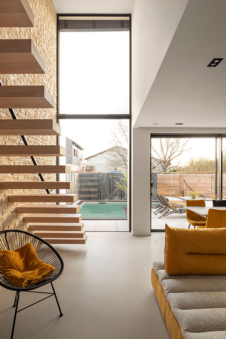 The organization of the program is conventional; the ground level consists of common areas and the first level of private spaces. The added value of this results from the double height and the very fluid communication between the interior and exterior areas thanks to the large windows on the full south side.